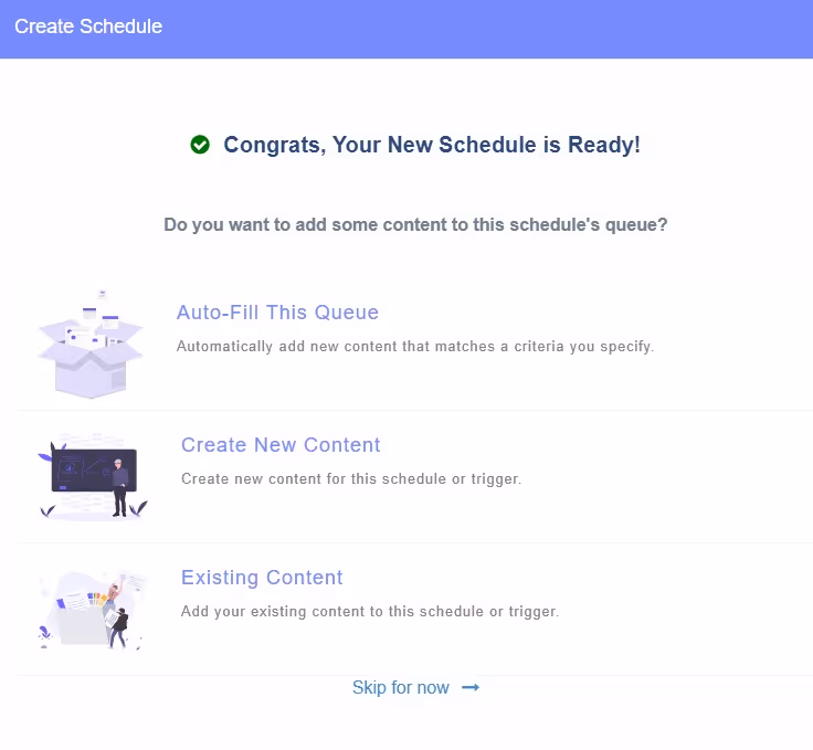 You can also create new content from scratch or add existing content to the schedule to save time filling the queue.