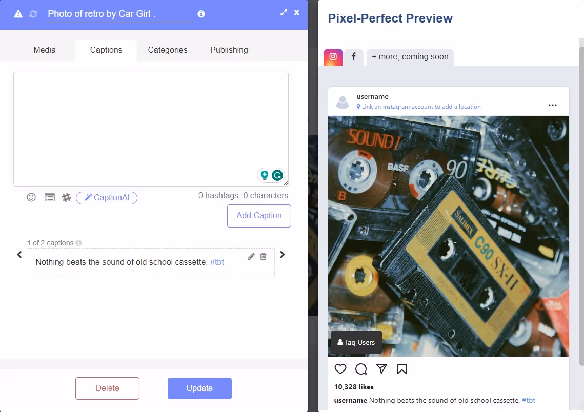 Open a piece of content, go to Captions, write out your copy, then click Add Caption. You can repeat this process to add more captions to the post.