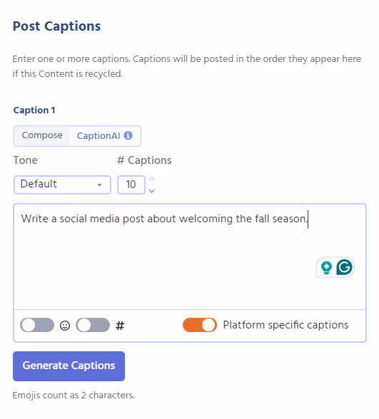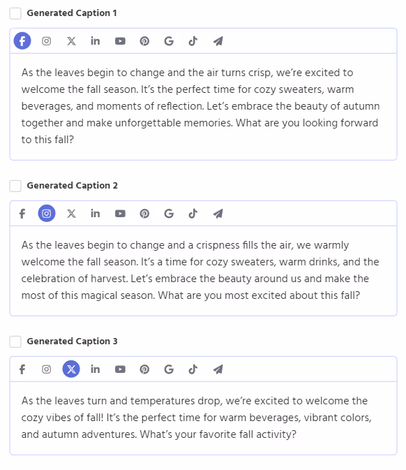Review and edit your platform-specific captions by clicking the social media icons for each caption, then select the captions you want to save to your post.